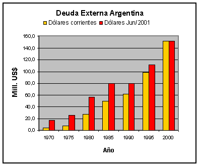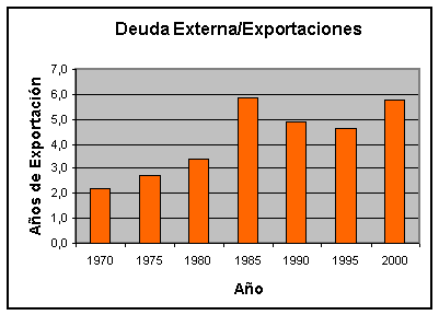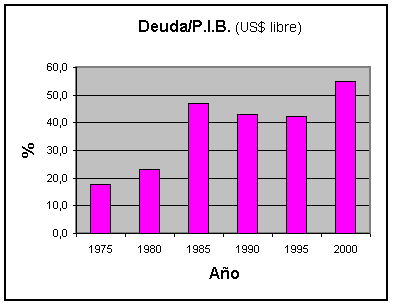 - Aumento de la deuda externa en 6 veces, medida en dólares constantes, y unas 3 veces con relación al P.I.B. y las exportaciones, entre 1975 y 2000 (ver Cuadros 5, 6 y 7).