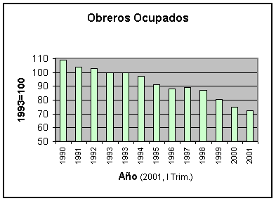 - Reducción de obreros ocupados en un 33% desde la sanción de la Ley de Convertibilidad hasta Junio de 2001 (ver Cuadro 3).
