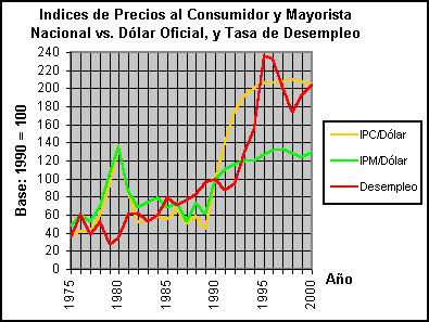 - Aumento del desempleo desde 2,6% en 1975 hasta casi 17% el pasado mes de Julio (ver Cuadro 4). La tendencia al aumento del desempleo sigue lenta pero sistemáticamente al aumento de los Indices de Precios medidos en Dólares (ver Cuadro 1).